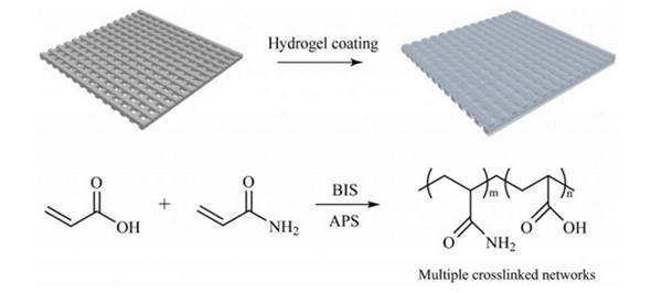 美國電影制作插圖水凝膠涂層工藝涉及N’甲基雙丙烯酰胺(雙)作為交聯(lián)劑和過硫酸銨催化劑的聚合。