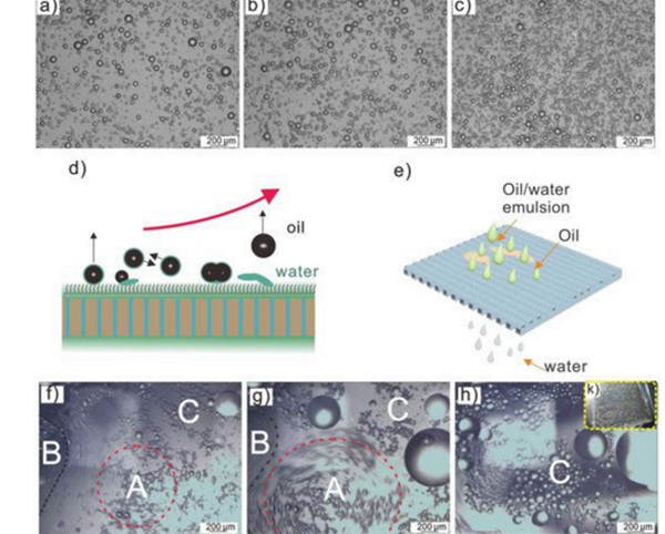 用光學(xué)顯微鏡和動態(tài)光散射法檢測了油水混合物在分離前后的液滴大小。此外,在光學(xué)顯微鏡下觀察到分離過程的進(jìn)一步表征,研究人員說:“利用多次重復(fù)實(shí)驗(yàn)進(jìn)行了分離回收試驗(yàn)。此外,該篩網(wǎng)還被設(shè)計成一種特殊的球形撇油器,能夠成功地收集浮油?!?/span>