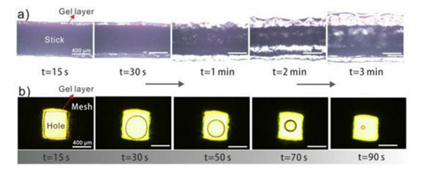 a)單個鐵/聚乳酸棒上水凝膠涂層生長的光學(xué)顯微鏡照片及反應(yīng)時間。