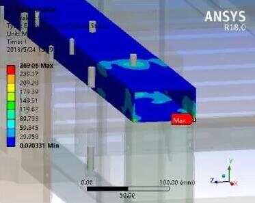 打印室立柱和支撐板焊接位置(右前處)在整機分析中的最大應(yīng)力為269MPa,超過了材料的屈服強度206MPa,具體見圖5所示。