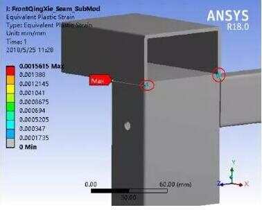 在考慮了材料塑性增強的子模型分析中,該部位的最大應(yīng)力降為247MPa,具體見圖6所示,但仍超過了材料的屈服強度,塑性變形區(qū)域主要集中在打印室立柱和支撐板焊接位置(右前處)焊縫的四個角點處,最大的塑性應(yīng)變0.00156,具體見圖7所示。