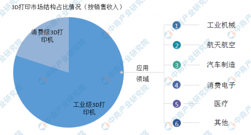 3D打印機主要分為消費級和工業(yè)級。工業(yè)級3D打印機速度更快、精度更高,在航空航天、汽車制造、醫(yī)療等領域廣泛應用。目前,工業(yè)級3D打印機在國內3D打印市場結構中,從銷售收入來看占比遠超消費級3D打印機。