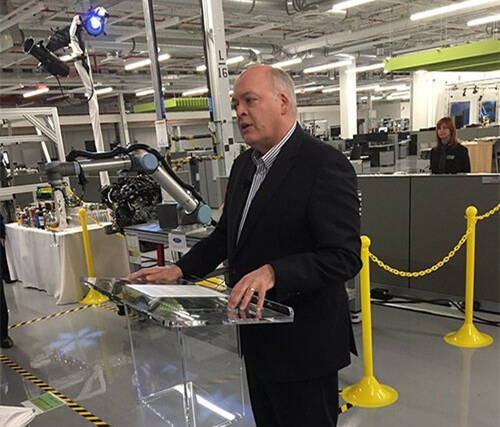 福特汽車公司(FordMotorCo.)首席執(zhí)行官吉姆·哈克特(JimHackett)最近在該公司先進(jìn)制造中心(Advanced該設(shè)施包括3D打印機(jī)、協(xié)作機(jī)器人、虛擬現(xiàn)實(shí)和增強(qiáng)現(xiàn)實(shí)設(shè)備。