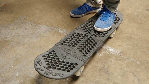 此前,魔猴網(wǎng)也報(bào)道過其他3D打印滑板的案例,2016年美國圣迭戈的3D打印公司SD3D 打印出了一個(gè)滑板,其強(qiáng)度、韌性和耐用性都達(dá)到了可以使用的程度。除連接輪子的金屬桿以外,其余所有部分均為3D打印。其中,板子本身和懸架使用的是3DXTech公司的碳纖維尼龍線材,重量約1公斤,輪子和軸承使用的則是Taulman3D公司的尼龍910線材。