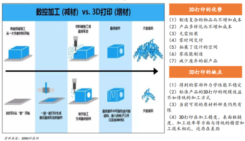 與傳統(tǒng)的減材制造方式相比,增材制造擁有制造復(fù)雜的物品而不增加成本、產(chǎn)品多樣化而不增加成本、無(wú)需組裝、零時(shí)間交付等眾多優(yōu)點(diǎn),尤其適合制造形狀復(fù)雜的、定制化的、追求輕量化的零部件。3D打印技術(shù)將持續(xù)促進(jìn)并受益于定制化經(jīng)濟(jì)的快速發(fā)展。