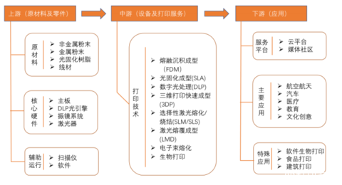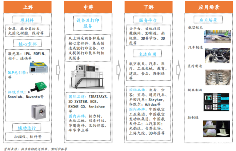 經(jīng)過(guò)30多年的發(fā)展,3D打印行業(yè)已經(jīng)形成一條比較完成的產(chǎn)業(yè)鏈,包括上游的各類(lèi)原材料、中游的3D打印設(shè)備及服務(wù),航空航天、汽車(chē)、醫(yī)療、教育等眾多下游應(yīng)用領(lǐng)域。