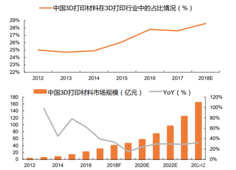 原材料是決定3D打印零部件最終質(zhì)量、價(jià)格的基礎(chǔ)因素,國(guó)內(nèi)中低端的原材料供應(yīng)能力已比較充足,高端原材料供應(yīng)仍受到一定限制。2017年我國(guó)3D打印材料市場(chǎng)規(guī)模達(dá)到29.92億元,同比增長(zhǎng)了約40%,占當(dāng)年整個(gè)3D打印行業(yè)市場(chǎng)規(guī)模27.6%,預(yù)計(jì)到2024年將達(dá)到164億元。