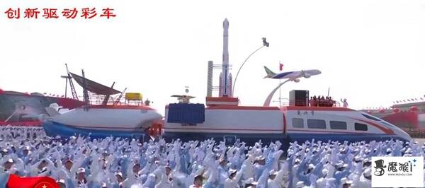 創(chuàng)新驅(qū)動(dòng)彩車(chē),一眼看去滿(mǎn)滿(mǎn)的科技風(fēng),以復(fù)興號(hào)動(dòng)車(chē)組列車(chē)、天宮二號(hào)空間實(shí)驗(yàn)室和蛟龍?zhí)栞d人潛水器這三大陸海空之大國(guó)重器為主體形象,拼接起來(lái)長(zhǎng)達(dá)39米,象征中華民族偉大復(fù)興道路上中國(guó)科技的飛速發(fā)展。彩車(chē)頂部展示了天河二號(hào)超級(jí)計(jì)算機(jī)、長(zhǎng)征三號(hào)運(yùn)載火箭、北斗衛(wèi)星導(dǎo)航、C919國(guó)產(chǎn)大型客機(jī)等十個(gè)中國(guó)最新科技成果,LED屏還顯示了5G元素。創(chuàng)新科技元素精彩紛呈,看得觀眾激情澎湃,自豪滿(mǎn)滿(mǎn)之情溢滿(mǎn)胸中。
