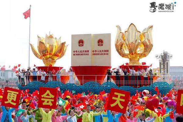 “一國(guó)兩制”彩車(chē)上,象征著香港和澳門(mén)的紫荊花和金蓮花璀璨奪目,中間樹(shù)立的香港、澳門(mén)特別行政區(qū)基本法莊嚴(yán)而神圣。