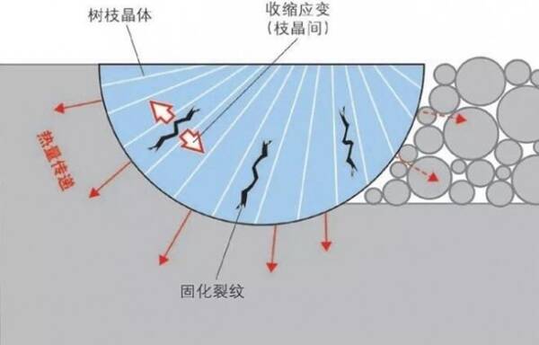冷卻的樹枝晶體在“糊狀”區(qū)域發(fā)生應(yīng)變,產(chǎn)生固化裂紋。來源:雷尼紹
