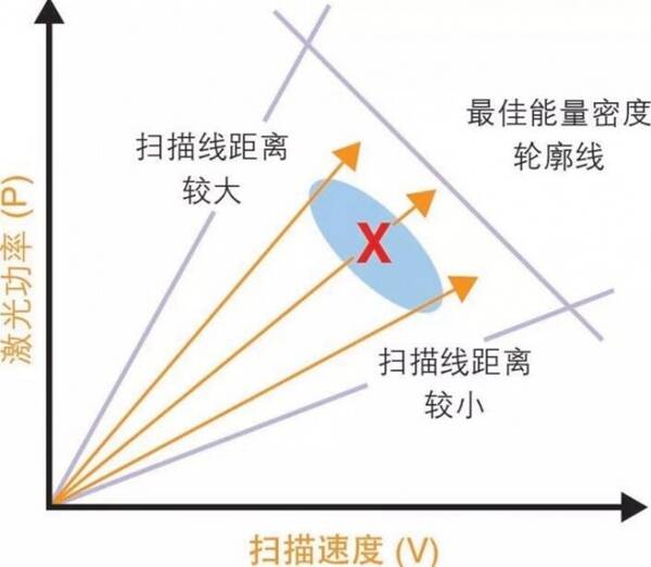 上文的分析中缺少一個關(guān)鍵因素:掃描線距離。上文的示意圖中假定掃描線距離是固定的,因此能量密度僅由激光功率和掃描速度決定。