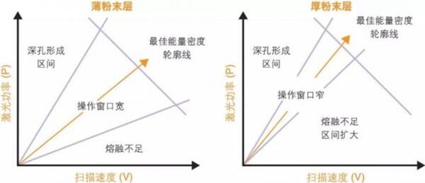 層厚增加會擴(kuò)大上圖上的“熔融不足”區(qū)間,從而縮小其與深孔形成區(qū)間之間的間隙。深孔形成區(qū)間本身可能不會隨層厚出現(xiàn)很大變化,因為這種效應(yīng)由激光光斑的強(qiáng)度和速度以及激光光斑與材料的相互作用方式控制。