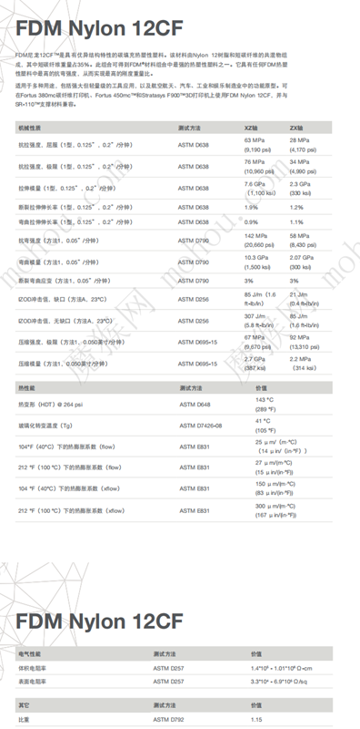 PA12CF-輕量高強(qiáng)碳纖維增強(qiáng)尼龍 (PA12CF)是一種在尼龍12里面添加碳纖維顆粒(占總重量35%)的一種新型材料,Nylon 12CF有很高的比強(qiáng)度(強(qiáng)度-質(zhì)量比)以及與其他高性能FDM材料平分秋色的拉伸強(qiáng)度。同時(shí),它的比模量(單位密度的彈性模量)是目前所有FDM材料里面最高的。