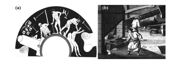 a)古希臘;青銅雕像鑄造,約公元前450年,(b)歐洲早期的鐵工廠:約1543年,來自英國的鑄鐵大炮[4]