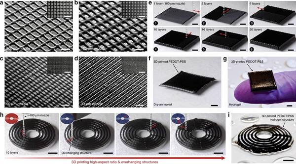 “這些聚合物解決方案很容易噴涂在觸摸屏等電子設備上?!甭槭±砉W院Zhao小組的研究生Hyunwoo Yuk說道, “但是液體形式主要用于均質(zhì)涂料,很難將其用于任何二維,高分辨率的圖案。在3D模式下,這是不可能的?!痹诒疚闹校芯咳藛T介紹了一種基于聚(3,4-乙撐二氧噻吩)聚苯乙烯磺酸鹽(PEDOT:PSS)的3D可打印導電聚合物墨水溶液。通常,它是一種液體狀的導電聚合物溶液,其中包含提供材料導電特性的納米纖維。麻省理工學院的研究小組將這種物質(zhì)轉(zhuǎn)變?yōu)橐环N類似于“粘性牙膏”的增稠材料,以使其可進行3D打印,同時仍保留了該材料固有的導電性。