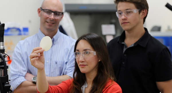 勞倫斯利弗莫爾國家實(shí)驗(yàn)室的研究員Cheng Zhu和前實(shí)驗(yàn)室博士后Wen Chen創(chuàng)建了由金和銀微粒子組成的油墨,打印后,3D零件被加熱,讓顆粒凝聚成金銀合金。這些零件被放入化學(xué)浴中,去除銀(這個過程被稱為 "dealloying"),形成多孔金。圖片由LLNL提供。
