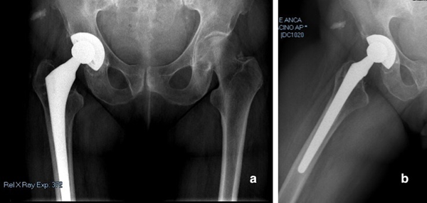 b)右髖部X光片側(cè)視圖顯示髖臼周圍骨質(zhì)溶解的輕度跡象,沒有植入物松動和髖臼骨折的跡象。