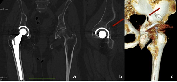 他們以一名75歲的女性為例,該女性在家庭創(chuàng)傷事件發(fā)生后進(jìn)入急診室。該患者有右髖嚴(yán)重髖關(guān)節(jié)病的病史,在使用非骨水泥THA治療前已有十年治療。醫(yī)生對她的骨盆進(jìn)行了AP射線照相,對她的臀部進(jìn)行了盤腿掃描,沒有發(fā)現(xiàn)髖臼或莖周圍骨折或松弛的跡象。但是,“通過MAR協(xié)議對骨盆進(jìn)行CT掃描”顯示,盡管髖臼杯未移位,但髖臼后壁確實有骨折。