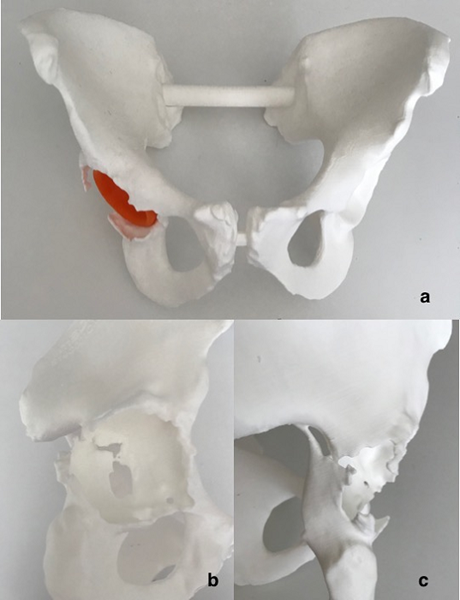 4:(a)整個骨盆的3D打印真人大小的塑料模型。 (b,c)特別是內(nèi)壁和后柱骨折。