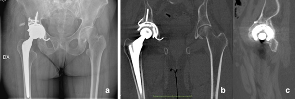 2:骨盆的CT掃描。 (a)冠狀視圖顯示髖臼杯略向內(nèi)側(cè)突出;