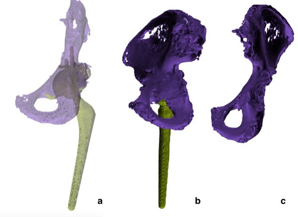 對骨盆和術(shù)后右髖部進(jìn)行的X射線照相顯示,植入物“定位良好且固定”。三個月后,對患者的骨盆進(jìn)行了CT掃描,結(jié)果顯示“小梁杯骨融合”并“形成了愈傷組織”,完成了骨折愈合。使用DICOM圖像構(gòu)建的3D數(shù)字模型證實了這一點。