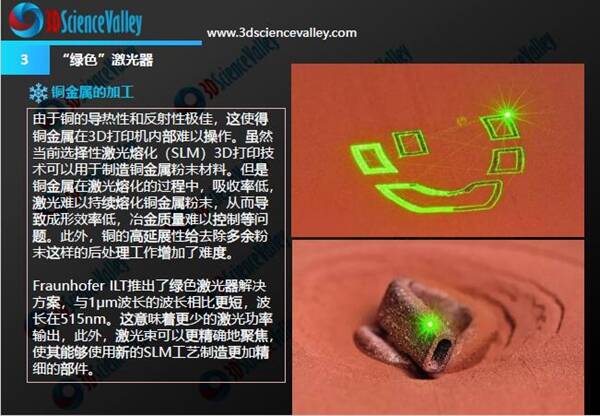 德國Fraunhofer ILT研究所 開展了“SLM綠色”項目,發(fā)現(xiàn)與現(xiàn)有方法相比,“SLM綠色”項目旨在“顯著提高細節(jié)分辨率以及更高的成本效益”。最具特色的是激光的顏色是綠色的。