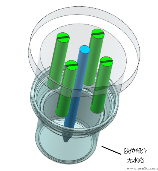 · 產(chǎn)品頭部有深腔位且直徑較小,導(dǎo)致普通機(jī)加工無法使后模鑲件水路深入膠位部分。