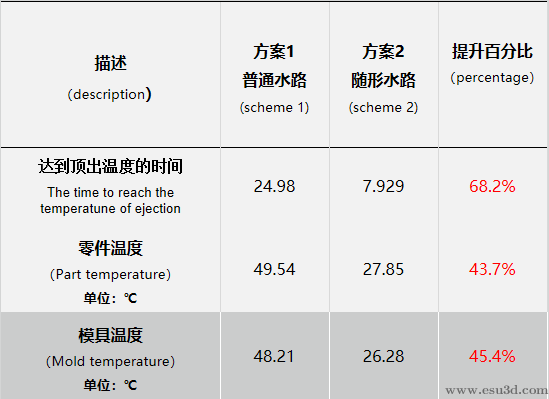 24.98s到7.92s,模具冷卻時(shí)間縮短近17s,達(dá)到68%,試問擁有這樣的增幅,借用一句網(wǎng)紅詞“這它不香嘛,還要啥自行車啊~”當(dāng)然模具3D打印優(yōu)勢(shì)不僅僅體現(xiàn)在冷卻時(shí)間,它的模具溫度,零件溫度均有一個(gè)較大的提升。