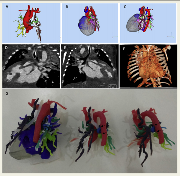 D–F。放射圖像和分割。副血管在CT圖像中不明顯。 G.最終的三維打印模型。 * C和F中的箭頭表示MAPCA