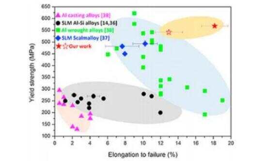 國(guó)際方面,高強(qiáng)度鋁合金的3D打印領(lǐng)域涌現(xiàn)出諸多的開發(fā)者,總部位于英國(guó)的鑄造專家Aeromet International其專利的用于增材制造的鋁合金粉末A20X所制造的零件已經(jīng)超過500MPa的極限拉伸強(qiáng)度(UTS)。A20X是一種鋁 – 銅合金材料,具有精細(xì)的微觀結(jié)構(gòu),與其他合金相比,具有“更高的強(qiáng)度,抗疲勞和優(yōu)化的熱性能。在測(cè)試中,3D打印的A20X粉末材料所制造的極限拉伸強(qiáng)度為511MPa
