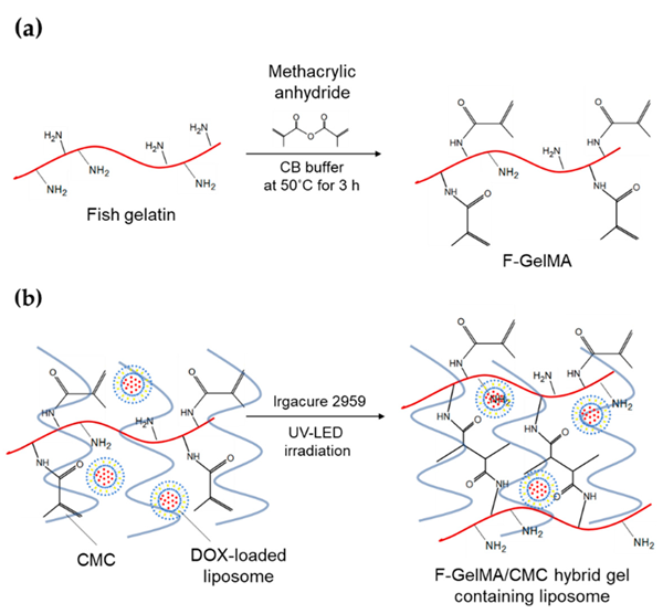 a)魚明膠甲基丙烯酰基(F-GelMA)的合成。 (b)交聯(lián)的F-GelMA和含有PEG化脂質(zhì)體的羧甲基纖維素鈉(CMC)的混合凝膠。反應(yīng)方案是在以前的研究中準(zhǔn)備的