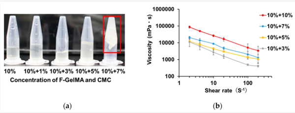 用作印刷油墨的藥物制劑的粘性。 a)含有不同濃度CMC的F-GelMA水凝膠的外觀。 (b)含有不同濃度CMC的F-GelMA水凝膠的粘度曲線。數(shù)據(jù)代表平均值±SD(n = 3)。