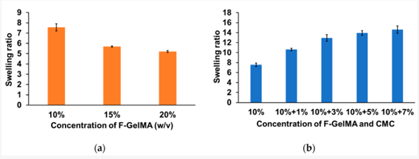盡管水凝膠由于其膨脹能力而通常吸引人,但對于本研究而言,研究人員制造了多種不同的材料,其中10%F-GelMA和7%羧甲基纖維素鈉(一種增稠劑)的組合顯示出溶脹率最高。光聚合后水凝膠的溶脹性能。 (a)不同濃度的F-GelMA的溶脹率。 (b)混合水凝膠的溶脹率(10%F-GelMA,CMC濃度不同)。數(shù)據(jù)代表平均值±SD(n = 3)。