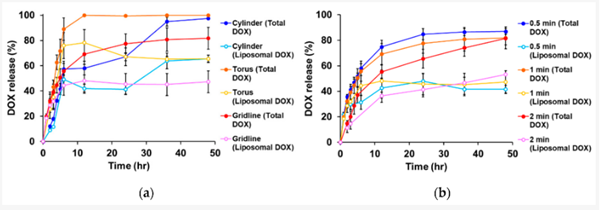脂質(zhì)體阿霉素(DOX)的藥物釋放曲線。 (a)形狀對藥物釋放的影響。紫外線暴露時間設(shè)定為1分鐘。 (b)紫外線照射時間對藥物釋放的影響。網(wǎng)格對象用于此實驗。數(shù)據(jù)代表平均值±SD(n = 3)。