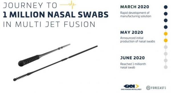 粉末冶金企業(yè)GKN 收購(gòu)的塑料3D打印企業(yè)FORECAST 3D,從3月份開(kāi)始著手開(kāi)發(fā)咽拭子的數(shù)字化制造解決方案,5月份開(kāi)始進(jìn)行首批3D打印咽拭子的生產(chǎn),6月份其產(chǎn)量達(dá)到100萬(wàn)個(gè),迄今生產(chǎn)的總量達(dá)300萬(wàn)個(gè)。