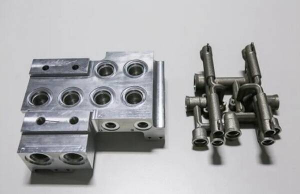 傳統(tǒng)液壓閥塊與3D打印液壓歧管。來源:Prodrive