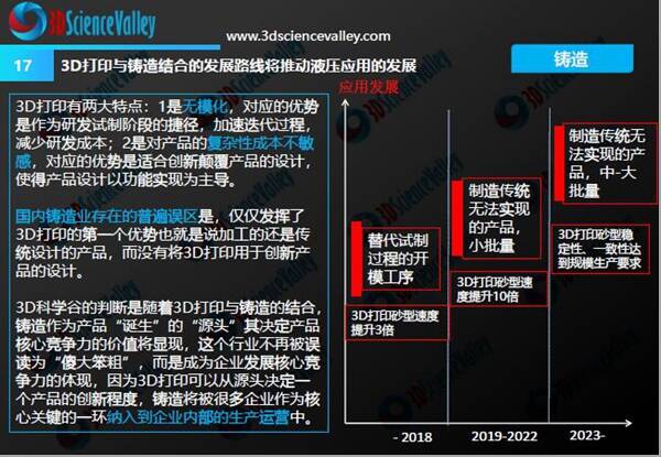 根據(jù)3D科學(xué)谷的市場觀察,采用3D打印與鑄造相結(jié)合的工藝來制造復(fù)雜液壓元件,也是液壓制造商正在探索的實現(xiàn)液壓元件設(shè)計優(yōu)化與性能升級的方式。著名液壓元件制造商博世力士樂在2015年左右就通過3D打印砂模與鑄造相結(jié)合的方式快速制造液壓元件。在剛剛結(jié)束的TCT 亞洲展中,也可以看到國內(nèi)工程機械研究機構(gòu)通過voxeljet-維捷粘結(jié)劑噴射3D打印技術(shù)制造的液壓閥體鑄造砂型,這一鑄造用的砂型也是進行了面向增材制造的設(shè)計,其中具有無法通過傳統(tǒng)技術(shù)實現(xiàn)的復(fù)雜流體管道。