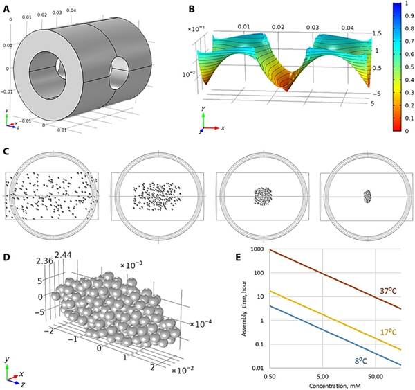 A)安裝在磁性生物組裝器中的磁體系統(tǒng)。 (B)磁鐵系統(tǒng)產(chǎn)生的磁場(chǎng)。 (C)構(gòu)造裝配過程的建模。 (D)組裝后構(gòu)造物的建模形狀。 (E)作為加多布特羅濃度和溫度的函數(shù)的構(gòu)建體組裝的動(dòng)力學(xué)。 (圖片來自“太空中3D組織構(gòu)造的磁懸浮生物組裝”)