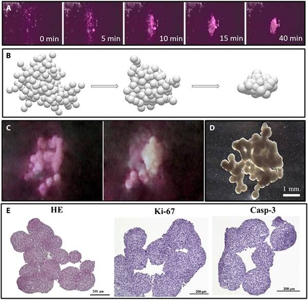 A)太空中磁性生物組裝機(jī)內(nèi)部構(gòu)建體組裝的延時(shí)照片。 (B)使用“ Surface Evolver”軟件將軟骨球融合成3D結(jié)構(gòu)的計(jì)算機(jī)模擬。 (C)在空間中進(jìn)行生物組裝的實(shí)際順序步驟;延時(shí)錄像的快照。 (D)組裝的3D構(gòu)造的宏觀攝影返回地球。 (E)在空間實(shí)驗(yàn)中組裝的3D組織構(gòu)建體的組織學(xué)[蘇木精和曙紅(HE)染色]和免疫組織化學(xué)[增殖標(biāo)志物Ki-67和凋亡標(biāo)志物caspase-3(Casp-3)]。 (照片來源:美國賓夕法尼亞州塞林斯格羅夫市薩斯奎漢納大學(xué)的Kenn Brakke;俄羅斯莫斯科生物技術(shù)研究“ 3D生物打印解決方案”實(shí)驗(yàn)室的Elizaveta Koudan。)