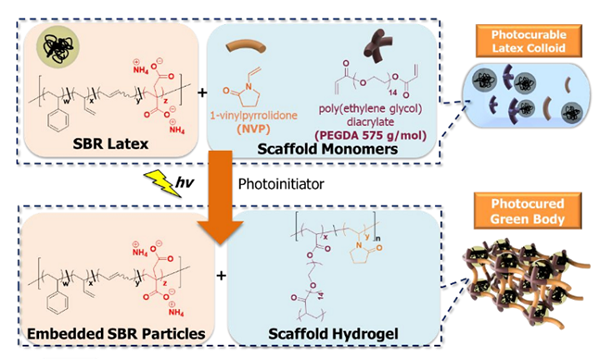 SBR膠乳的連續(xù)相中進(jìn)行PEGDA和NVP的光固化,得到嵌入SBR顆粒的水凝膠。