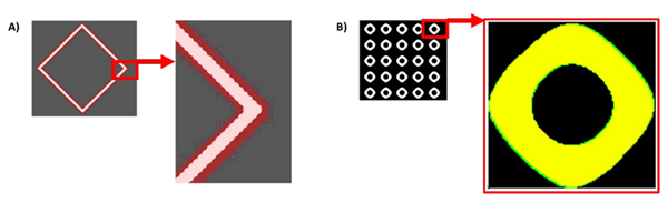 通過計算機(jī)視覺捕獲的單像素強(qiáng)度分布用于計算投射到樹脂表面的任何圖案的總體強(qiáng)度分布。由正方形晶格(A)和Schwarz晶格(B)的投影產(chǎn)生的強(qiáng)度分布的模擬說明了所需輪廓和投影輪廓之間的不一致。邊緣處的散射[(A)和(B)中的紅色和綠色區(qū)域]導(dǎo)致制造了邊緣清晰度不佳的超大特征。