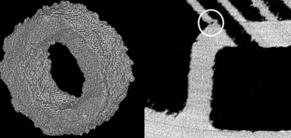 左上方:重建的CT數(shù)據(jù),顯示小管的實際表面光潔度;右上方:突出顯示嚴重缺陷的CT切片圖像。來源:Conflux