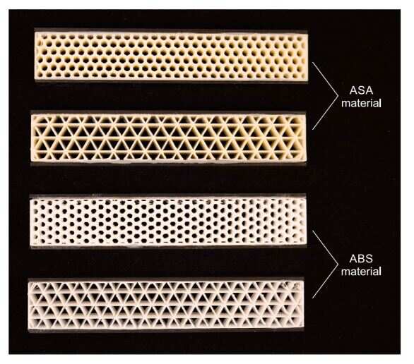 選擇FDM(使用FlashForge Creator Pro)來制造兩種類型的復(fù)合結(jié)構(gòu),即使用具有碳纖維面板的ABS和ASA(丙烯腈苯乙烯丙烯酸酯)。制造了兩種用于芯的拓?fù)浣Y(jié)構(gòu),一種為桁架或三角形,另一種為蜂窩或六角形。為了了解載荷和熱老化對(duì)結(jié)構(gòu)的影響,使用壓縮,拉伸和三點(diǎn)彎曲測(cè)試來研究這些部件的機(jī)械性能和失效。
