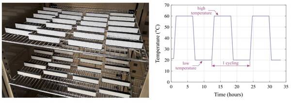 該研究還暗示了連續(xù)纖維增強(qiáng)如何比短切纖維提供更好的破壞載荷性能,因?yàn)槌跏计茐耐l(fā)生在孔壁內(nèi)的細(xì)絲交叉處:“蜂窩狀細(xì)胞具有更好的性能,因?yàn)樵诩?xì)胞壁之間存在更多的連續(xù)細(xì)絲。熱老化對(duì)這些連接也有更大的影響,因?yàn)榉肿拥乃沙诤椭亟M增加了連接的韌性。”為了模擬熱老化,通過在氣候試驗(yàn)箱中使樣品經(jīng)受變化的溫度來“老化”樣品。最高/最低溫度分別為60攝氏度和22攝氏度(低于聚合物的玻璃溫度),采用自動(dòng)化,高精度和高精度的設(shè)備,將溫度變化率控制在1攝氏度/分鐘。