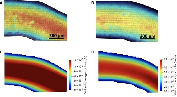LLNL進(jìn)行的計算機(jī)分析揭示了癌細(xì)胞聚集在3D打印的血管結(jié)構(gòu)中的模式。圖片來自LLNL。