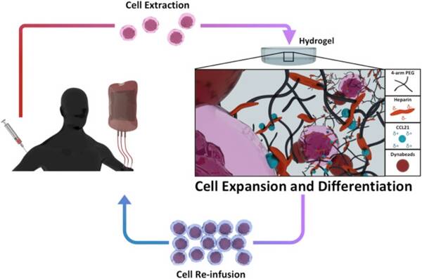 顯示過(guò)繼性細(xì)胞治療過(guò)程的簡(jiǎn)化圖。圖片來(lái)自《生物材料》雜志。