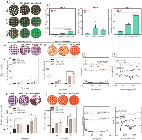 體外評估印刷支架的生物活性。 A)在基礎(chǔ)培養(yǎng)基中eMSCs培養(yǎng)14天期間,來自活死染色測定的共聚焦圖像。 B)每個(gè)支架的活細(xì)胞和死細(xì)胞分布的定量結(jié)果。 C和G)印刷樣品的堿性磷酸酶(ALP)圖像。將ALP活性水平相對于DNA含量標(biāo)準(zhǔn)化。 D和H)在培養(yǎng)30天后使用茜素紅S染色研究的通過eMSCs形成鈣化基質(zhì)的形成。使用比色法通過3D打印支架上茜素紅S含量評估的鈣化基質(zhì)的定量數(shù)量。比例尺代表1毫米。 E和I)XRD和F和J)培養(yǎng)eMSCs后對支架的FTIR分析。對應(yīng)于羥基磷灰石的峰用紅色圓圈標(biāo)記。 (要解釋此圖例中對顏色的引用,請參閱本文的Web版本。)