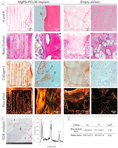 在對馬模型進(jìn)行6個(gè)月的體內(nèi)研究后進(jìn)行組織學(xué)評估。 A)6個(gè)月后,MgPSr-PCL30支架內(nèi)新骨(*)的組織學(xué)評估。代表性的蘇木精和曙紅,堿性品紅/亞甲藍(lán)染色的MMA樣品,I型膠原蛋白(棕色區(qū)域)的免疫組織化學(xué)染色以及由MgPSr-PCL30支架(S)填充的缺損和空缺損的picrosirius紅染色的組織切片。比例尺為50μm。 B)新形成的骨骼的EDX分析。鄰近支架支柱的新形成骨骼的代表性BSE圖像。 C)對新形成的骨骼和天然骨骼進(jìn)行的鈣和磷分析。 (要解釋此圖例中對顏色的引用,請參閱本文的Web版本。)