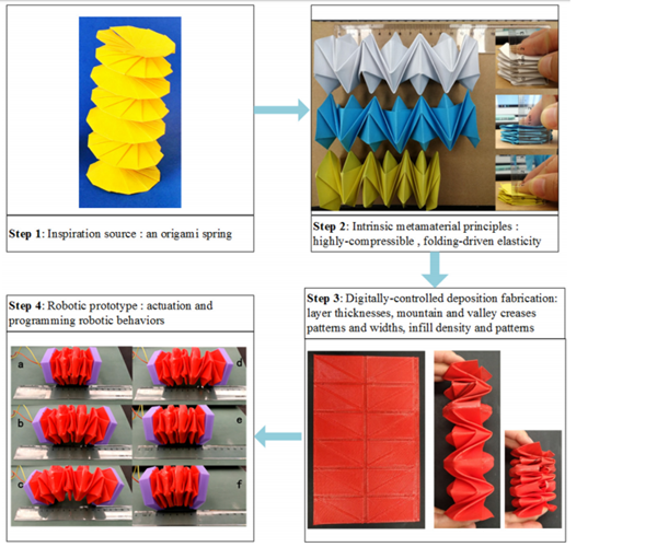 該團(tuán)隊(duì)從可折疊的折紙彈簧開始,然后發(fā)展到超材料角色-探索從折疊的幾何形狀獲得的屬性。最終,由于3D打印材料根據(jù)需要折疊,他們的原型能夠爬行行為。