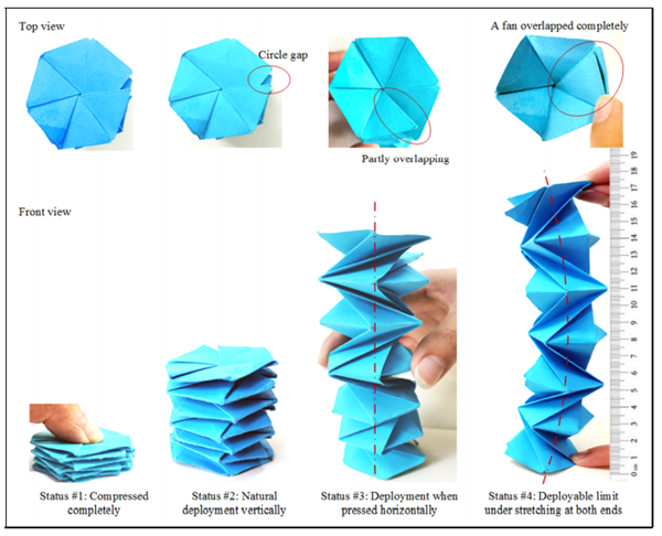 可折疊紙彈簧的內(nèi)在特質(zhì)機(jī)制:(a)狀態(tài)#1-#2:高度可逆的可壓縮性,(b)狀態(tài)#2-#3:在橫向壓縮和縱向拉伸性之間具有良好的可切換性,以及(c)狀態(tài)#4:曲線部署。